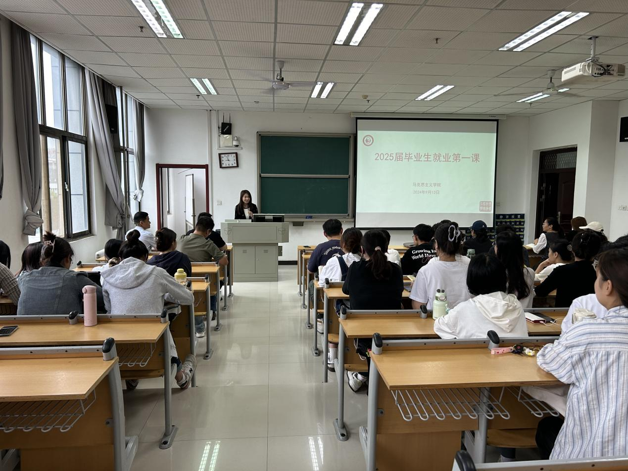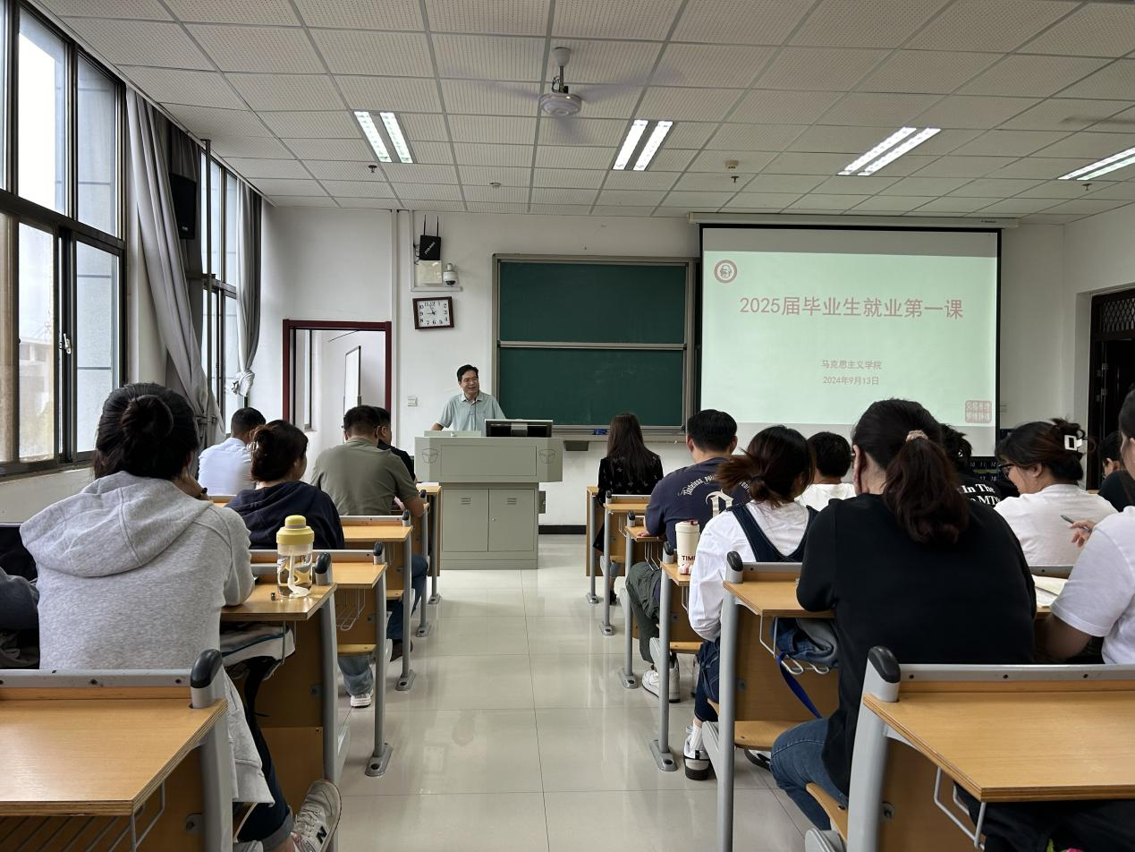 9月13日上午,马克思主义学院在文综楼504教室开展2025届毕业生“就业第一课”。党委书记谢依楠,院长周耀宏,党委副书记岳凯声,副院长林云飞、菅强出席活动,思想政治教育系主任王登科,就业专干王秋香,辅导员刘雪、杨晓培、樊晓歌和2025届毕业生参加活动。此次活动由党委书记谢依楠主持。