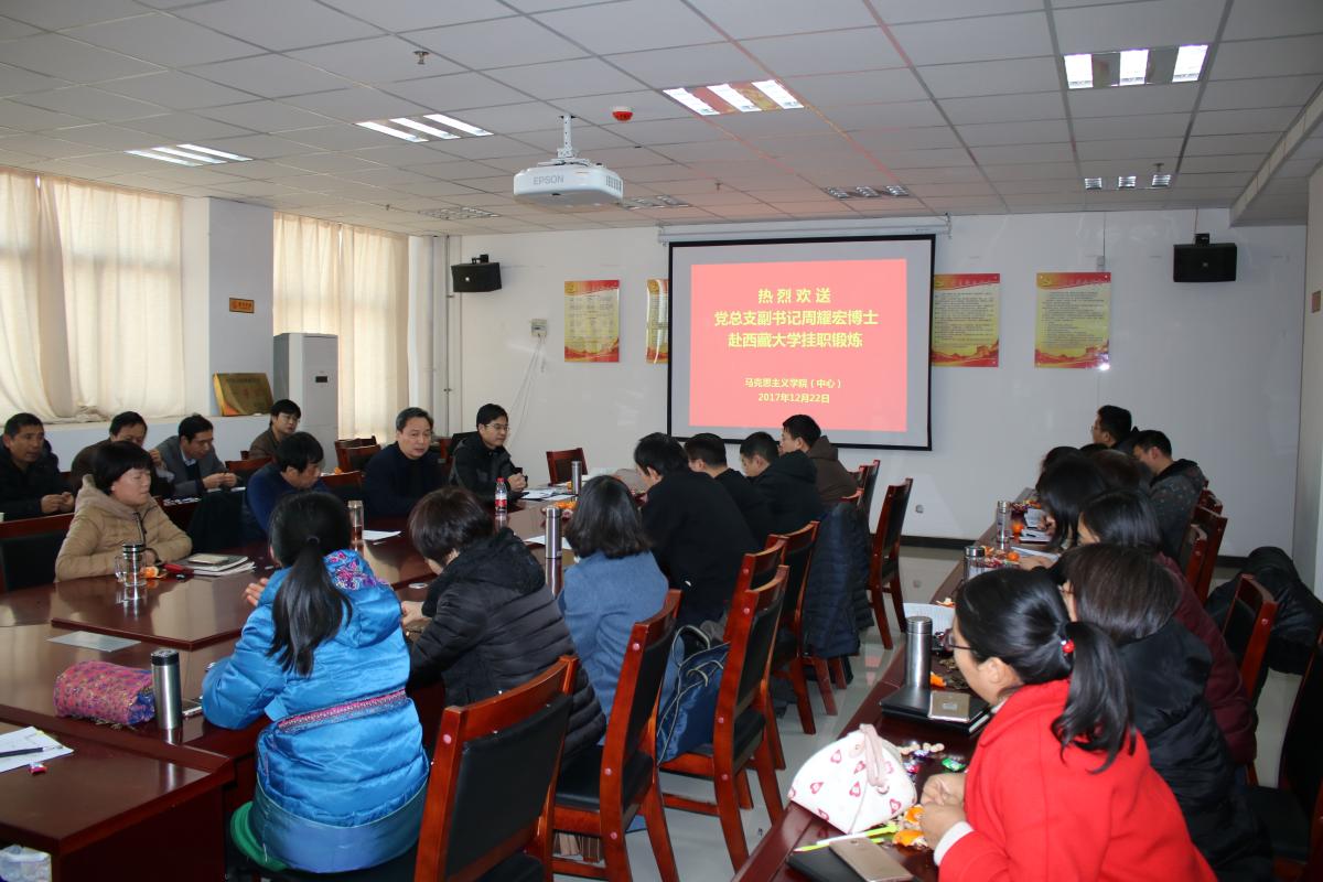 12月22日上午,我院(中心)全体教职工在E-1130会议室欢聚一堂,热烈欢送党总支副书记周耀宏博士赴西藏大学马克思主义学院挂职锻炼。党总支书记许涛同志主持欢送会。