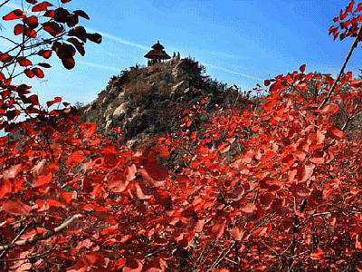 此次秋游恰逢雨后初霁,在璀璨的秋阳下,天空蔚蓝,鸟鸣山幽,风轻云淡,令人游兴盎然。大家神清气爽,纷纷健步向前,先后游览了一线天、烽王台、钻天洞、簸箕掌、摘星楼和大鸿寨主峰。深秋的大鸿寨,漫山遍野的红叶,似火如霞,把群山装扮的分外妖娆,真堪与北京香山媲美。“看万山红遍,层林尽染”,正是“只言春色能娇物,不道秋霜更媚人”。
