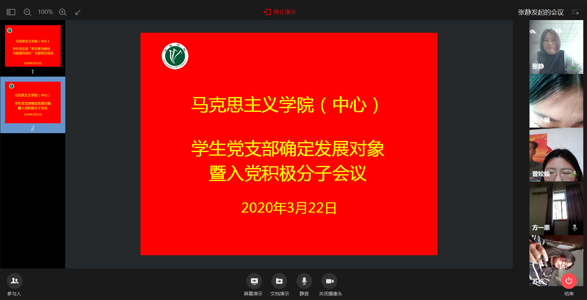 2020年3月22日下午,我院学生党支部采取网上会议的方式召开确定党员发展对象和入党积极分子会议。会议由我院学生党总支书记张静主持,参加此次会议的有学生党支部全体成员、本次会议即将确定的发展对象和入党积极分子以及19级思想政治教育1班辅导员冯璐彤老师。