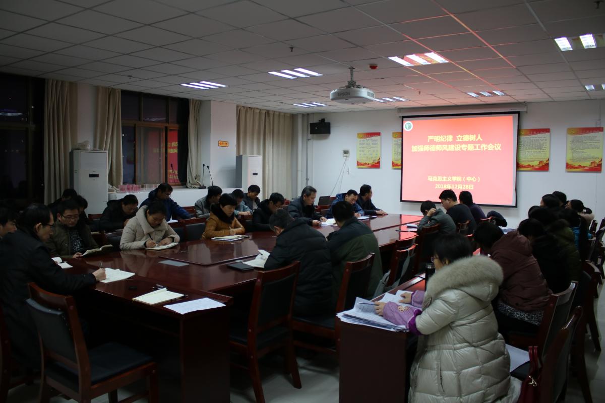 为进一步严明课堂教学政治纪律,保证教师坚持正确的政治方向, 2018年12月28日晚上七点,马克思主义学院(中心)召开全体教职工会议,就进一步加强师德师风建设作专题部署。会议要求,全体教职工要认真贯彻执行党和国家的教育方针政策,牢固树立“四个意识”、坚定“两个维护”,切实肩负起立德树人、教书育人的神圣职责。党总支书记许涛主持会议,院长寇鸿顺、副院长张凤云参加会议并讲话。