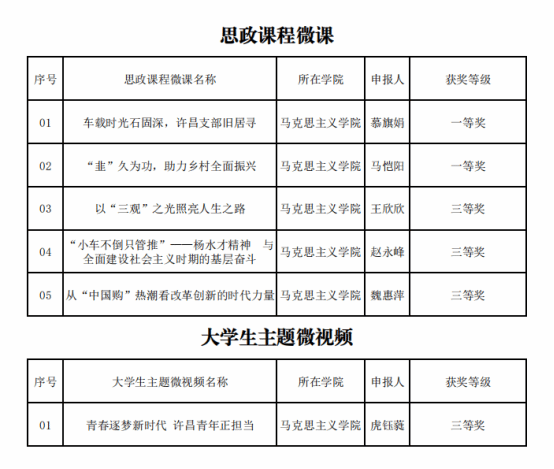 近日,河南省社会科学界联合会、共青团河南省委、河南省高等教育学会联合公布2025年度河南省大思政微课(微视频)征集活动评选结果。我院师生凭借扎实的理论功底、新颖的呈现形式荣获思政课程微课一等奖2项、三等奖3项,大学生主题微视频三等奖1项,充分彰显了我院“大思政课”建设的丰硕成果与育人实效。